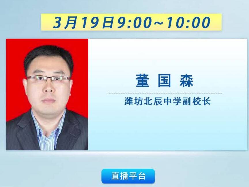 3月19日上午9:00~10: 00,濰坊北辰中學副校長董國森將走進市融媒體中心新聞頻率《政策訪談》欄目直播間,敬請關注!